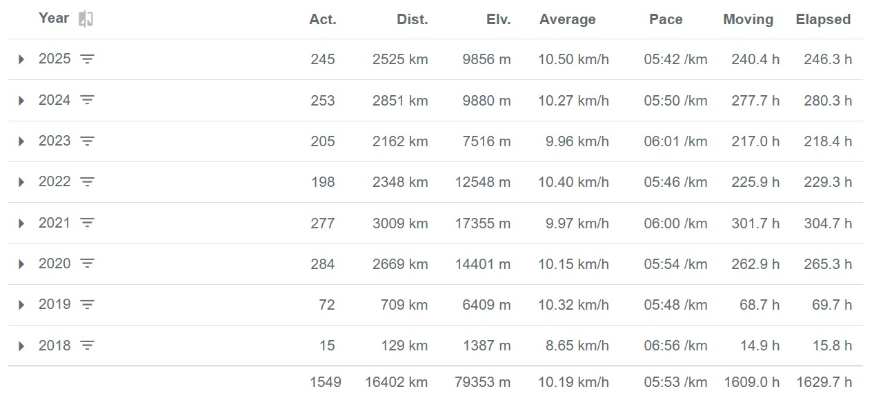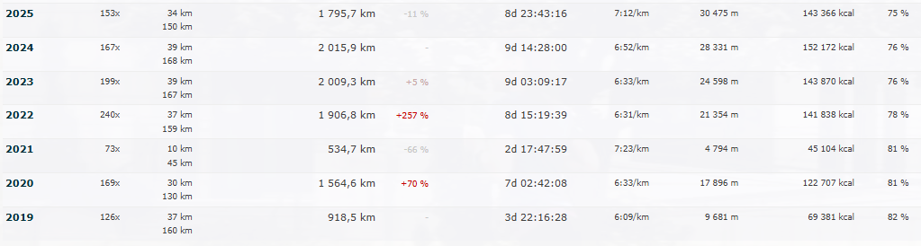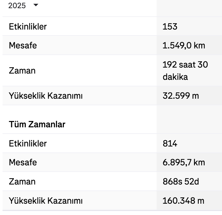 2025 senesi icin 2200km hedef koymuştum kendime. Fakat son dört ay is yogunlugumun artması sebebiyle 1652 km de kaldım.19.0295m yukseklik kazanimim olmuş. Bu sene için hedef gene 2000km üstü. Umarım başarırım. Yılın ilk yarısı iyi gidiyor ama ikinci yarısı hedeften şaşıyorum..