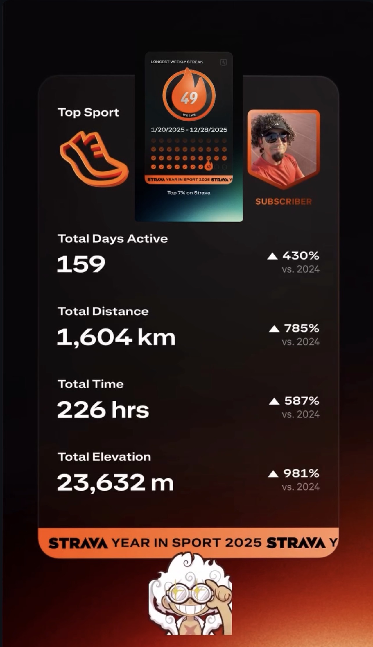 2024 yılında 1555km mesafe koşmuştum ve 2025 yılında hedefimi 2000+ seviyelerinde belirlemiştim. Fakat evdeki hesap çarşıya uymadı maalesef. Bu sene neredeyse 5 ay koşmadan sporsuz geçti ve 2025’i 1393km ile bitirdim. Sağlık olsun.