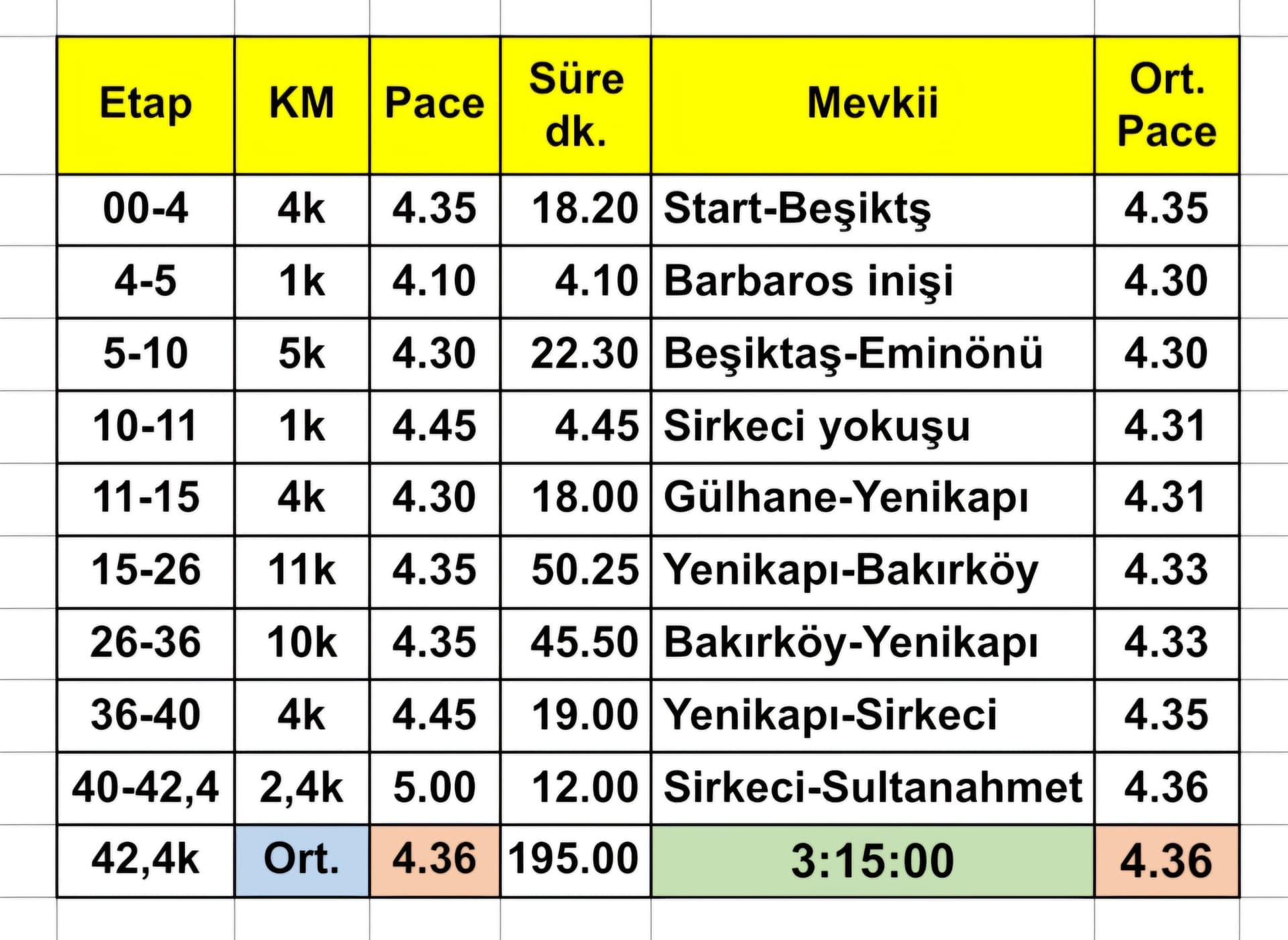 Geçen seneki konuda bu ince işçiliği görünce çok etkilenmiştim. Bu seneki İstanbul yarı maratonunda bir benzerini uygulayarak tüm kilometrelere hakim olmayı başardım. Yer yer güvenli pacelere düşmek beni yarışlarda çok rahatlatıyor.