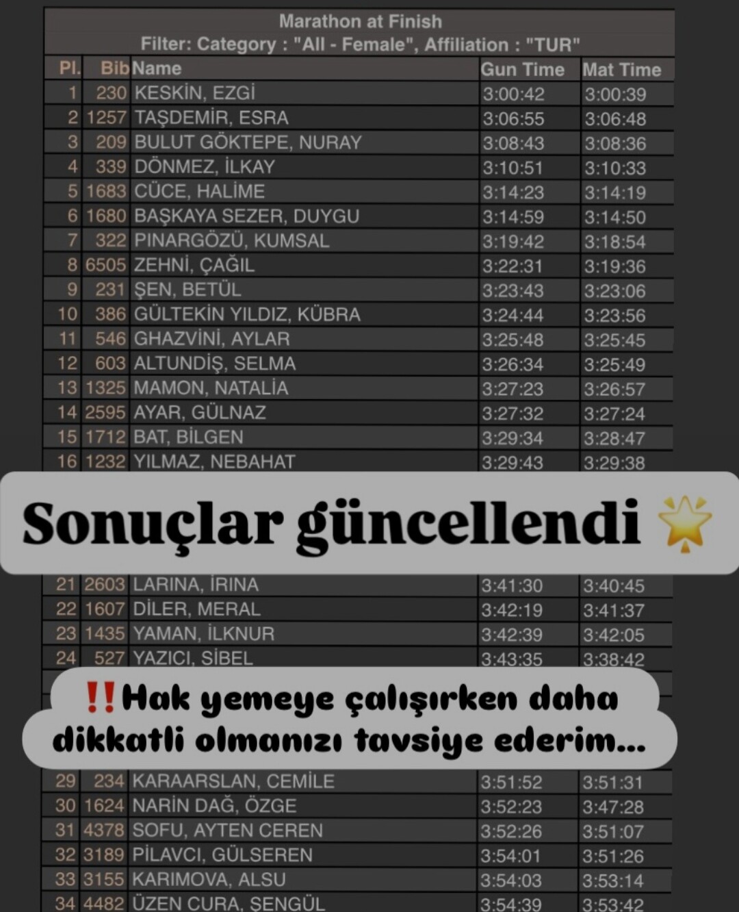 Sonuçlar düzeltildi, tahmin edildiği üzere “oturum izniyle” Türk tasnifinden yararlanan sporcuların olması üzücü bir durumdu. Neyse ki bundan sonra kürsü yapan arkadaşların daha dikkatli olması gerekmekte. Yarışta koşup kazanmanız yetmezmiş gibi ikinci bir koşuşturma ve mücadele vermek durumunda kalabiliyoruz.