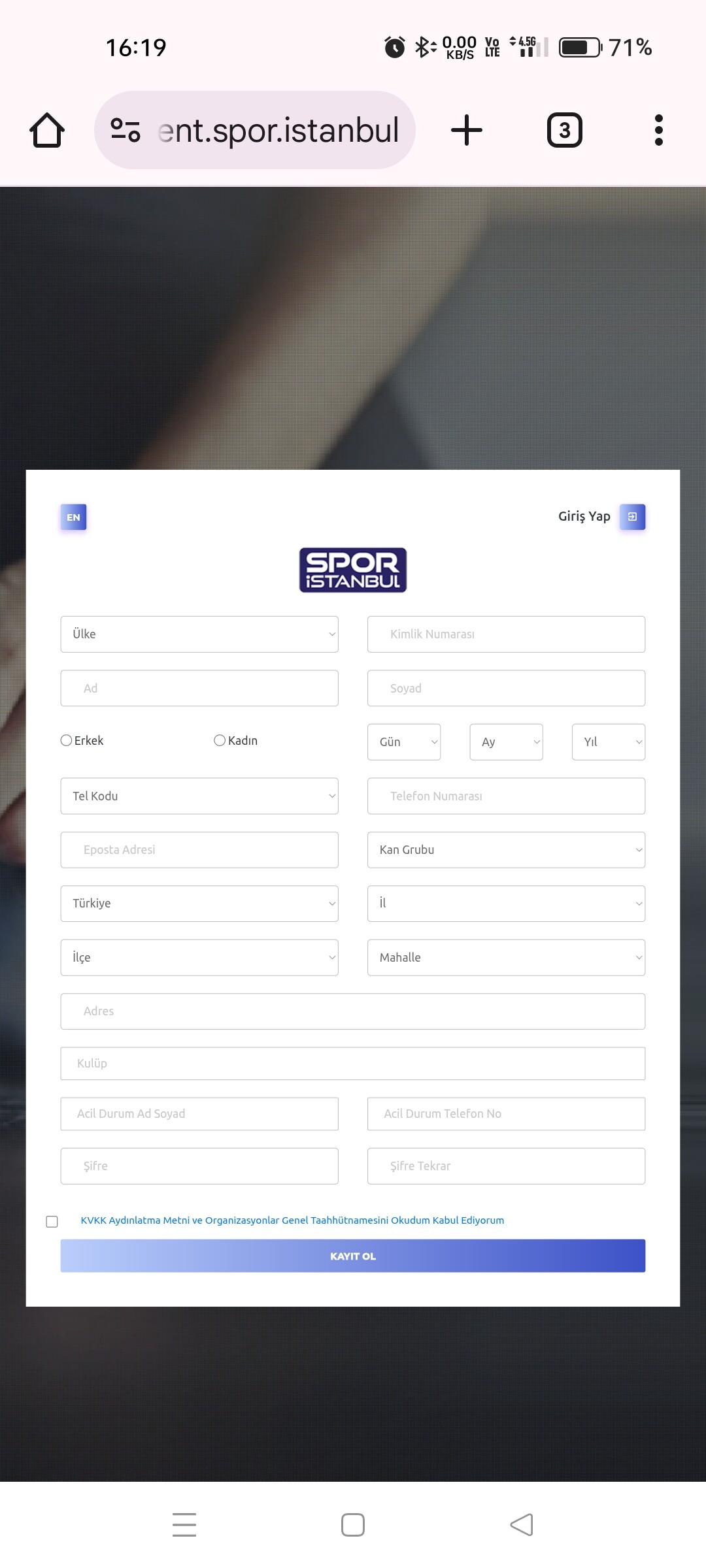Maraton kaydi için bu sayfadan üyelik başlatmak gerekiyor. Bence sorun burada başlıyor. En yukarıda Ülke ve kimlik numarası var.