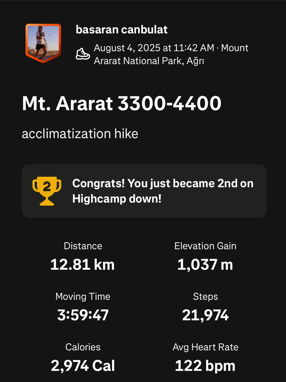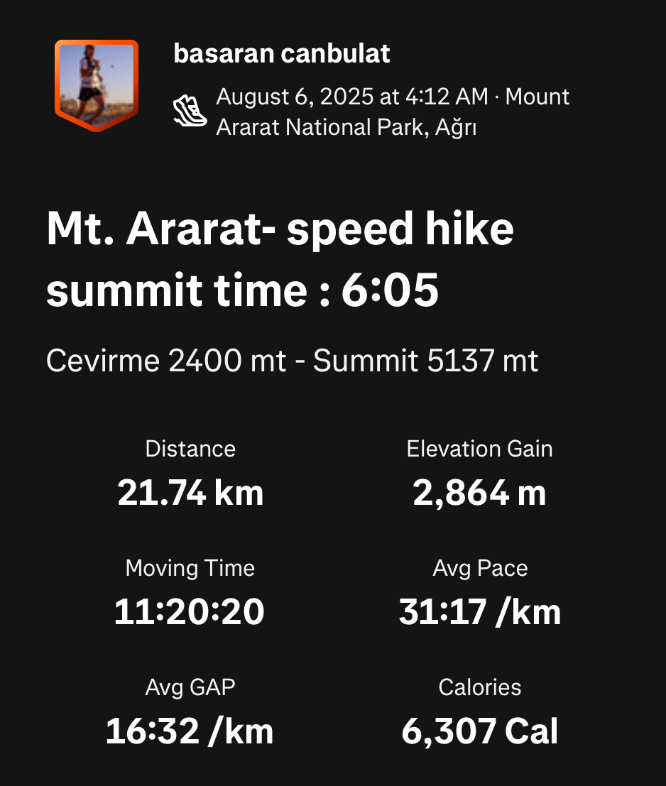 Ağrı dağı için genelde 3 günlük tırmanış programı öneriliyor. Ağustos ayında 4 koşucu arkadaş hızlı şekilde zirveye çıkıp indik. 2400 çevirme köyünden zirveye tek seferde yaklaşık 6 saatte ulaştık. İniş ve çıkış toplam 11 saat civarı sürdü. Trail ayakkabısı ve trail kramponları kullandık. 4900mt sonrasında kaztüyü montları giydik. 2 gün önce de aklimatizasyon çıkışı yapmıştık. Benim asıl merak ettiğim kontrol için görevli arkadaş acaba zirvede ne kadar kalabilir ![]()