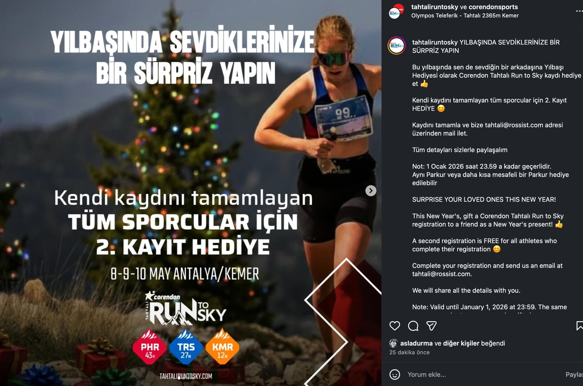 Yılbaşı kampanyası yapmışlar. Skyrunner yarış listesine girdiği için fiyatlarını €uro’ya geçirip bir anda arttırdıktan sonraki sene yarış listesinden çıkartılmalarını takiben yerli yarışçılarla yeniden baş başa kalan Tahtalı Run to Sky, agresif kampanyalar ile kaybettiği yerli yarışçı kitlesine yeniden ulaşmaya çalışıyor.