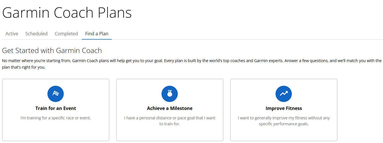 Yakın zamanda Fenix 6 Pro’dan 7 Pro’ya bir geçiş yaptım. Onunla birlikte Fenix 7’de Garmin Coach uygulamasının çok daha iyi olduğunu gördüm. Fenix 6’da, 3 hocadan birini seçmeniz gerekiyor ve en fazla yarı maraton programı veriyordu. Fenix 7’de ise artık coach sormuyor, aşağıdaki görselde göreceğiniz üzere 3 hedeften birini soruyor.