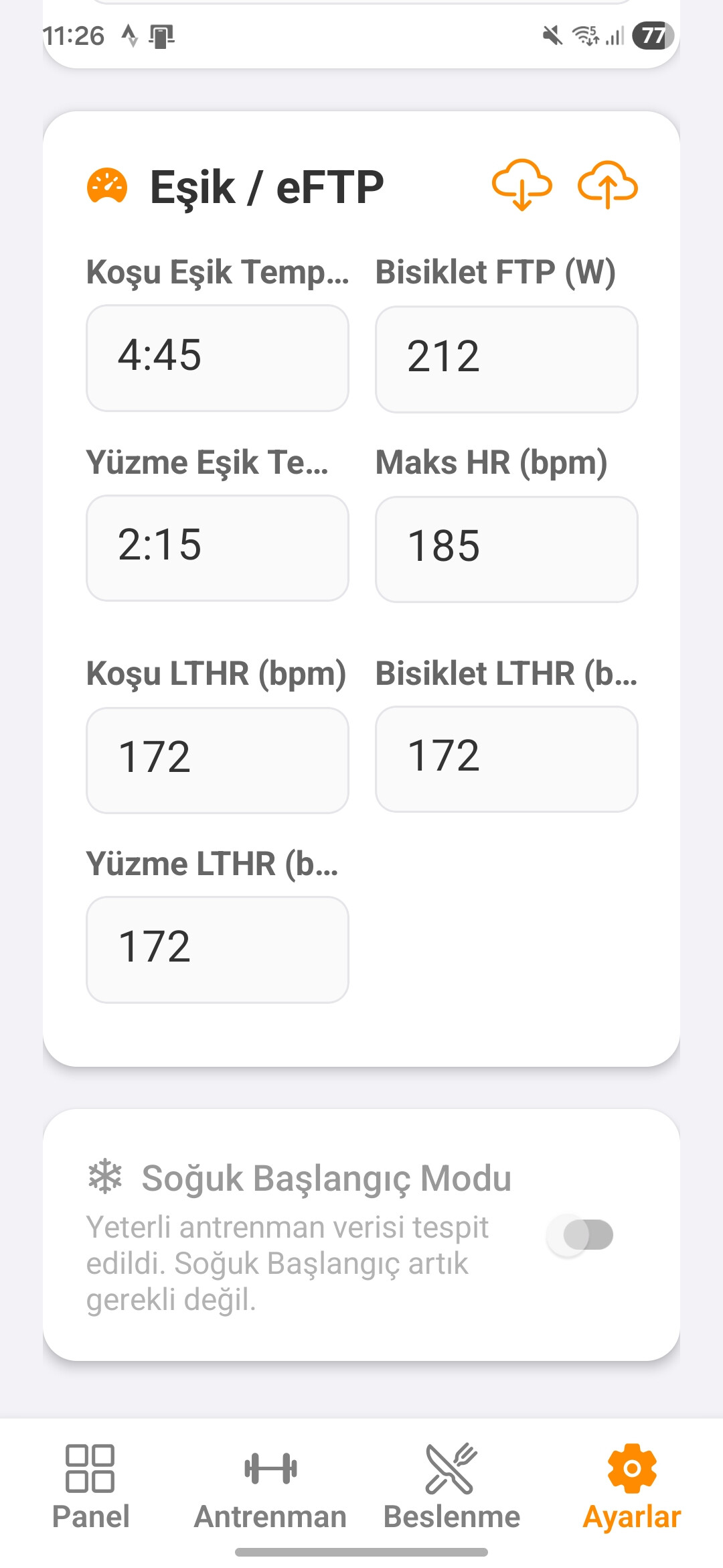 Ayarlarda önce intervals.icu’ya girdiğiniz bilgileri senkronize edebileceğiniz, eğer yanlışsa İntervals.icu’ya doğru bilgileri gönderebileceğiniz bir bölüm var. Oraya bakar mısınız senkronize mi? Eğer değilse ben ne sorun var ilgileneyim.