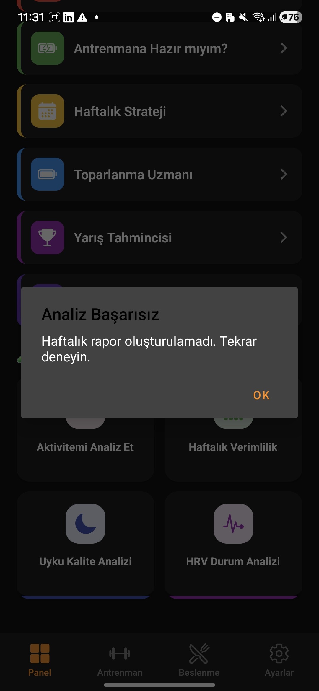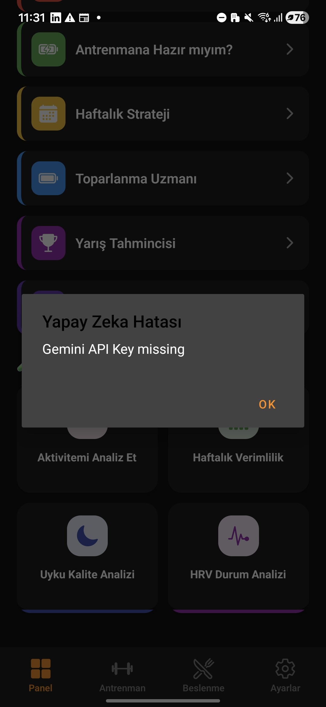 Sabah kendime antrenman çıkardığımda AI koç’un recovery pro’dan farklı antrenman verdiğini gördüm. Sanırım yaptığım iyileştirmelerde recovery pro ile AI koç arasındaki senkronizasyonu ya tarih olarak bozdum ya da başka bir uyumsuzluk var. Ondan dolayı son sürümde böyle bir sıkıntı yaşarsanız sorun benden kaynaklı. Gün içinde çözüp yeni sürüm vermeye çalışacağım. Sadece Android tarafını etkiliyor sanırım. IOS’a bu sürümü vermemiştim. Bir önceki sürümde de kopuk olup olmadığını da IOS için bakacağım.