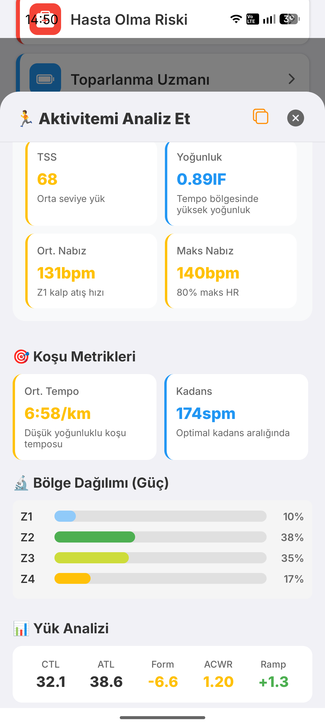Hemen her antremandan sonra analiz özelliğini kullanıyorum ama interval antremanlarından sonra uygulamanın yorumları, çok antreman tipine göre değil de daha yuvarlak bir analiz yapıyor sanki (belki gemini ile ilgilidir), biraz daha geliştirilebilir belki..