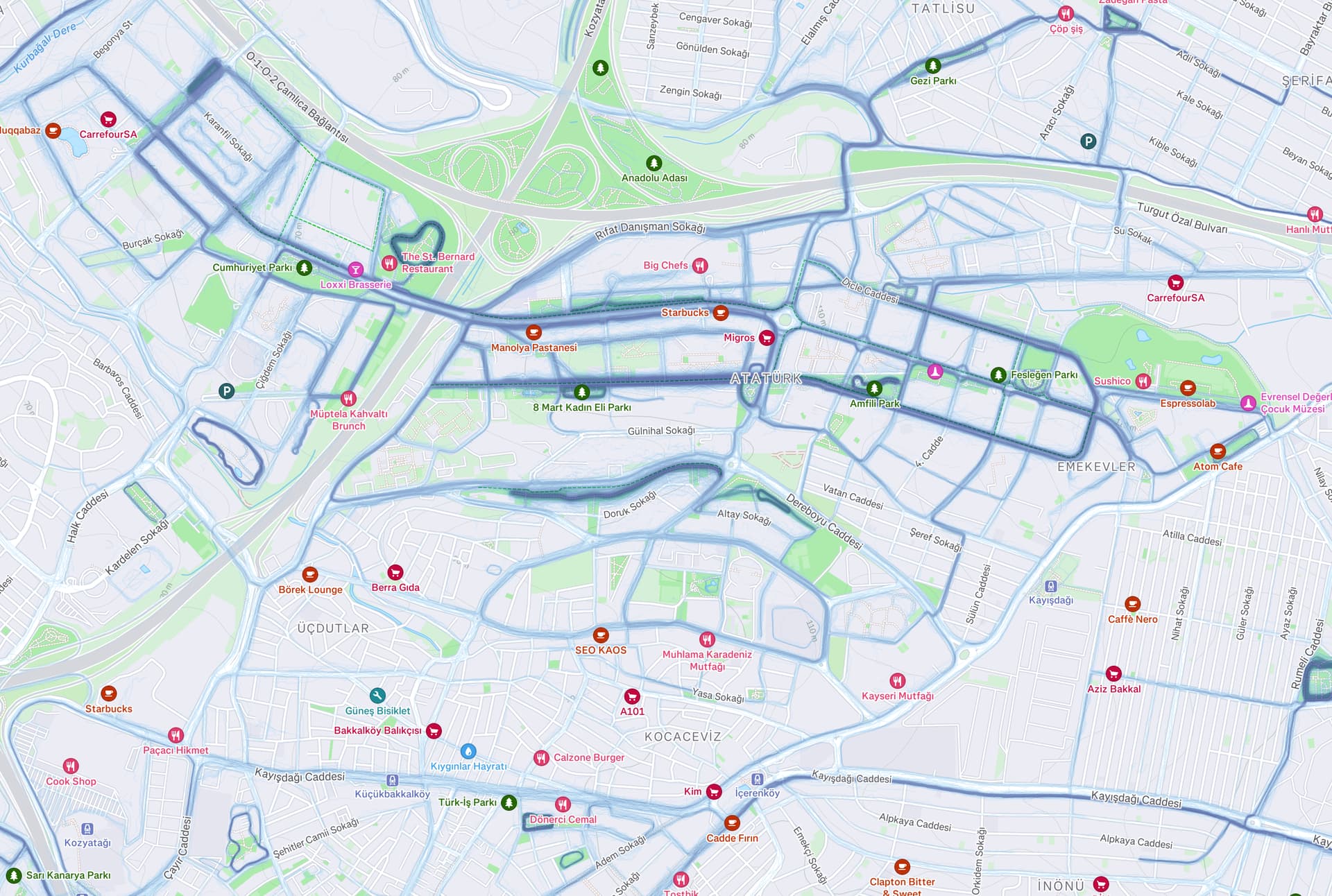@ggg de bahsetmiş, Strava+heatmap ile arama yaparak servisin sıcaklık haritasından faydalanabilirsiniz. Ben kimseyi tanımadan yerleştiğim şehirde hayatımı strava heatmap ile kurdum desem abartmış olmam. Yeni bir yere gideceğim zaman da mutlaka strava heatmap’e bakıyorum. Şehrin röntgeni.