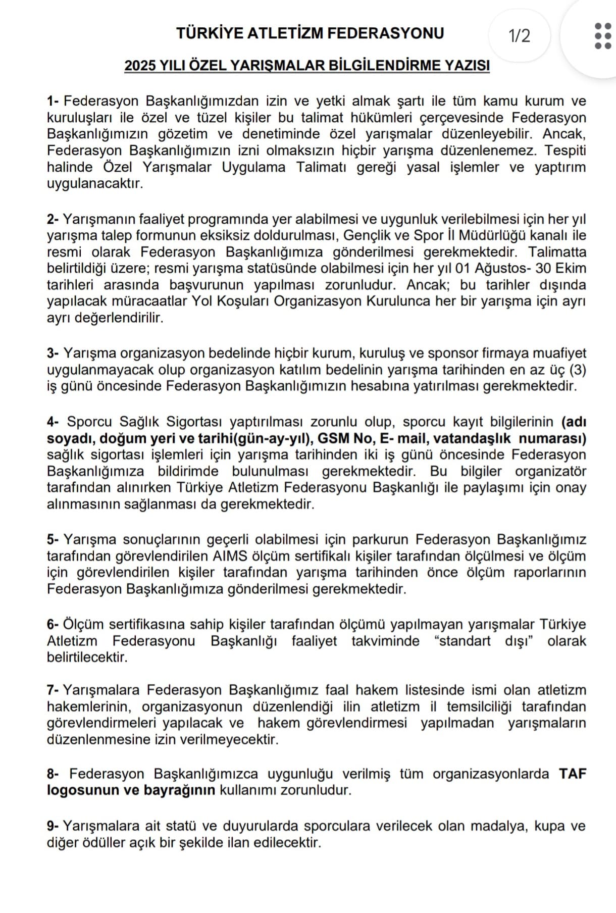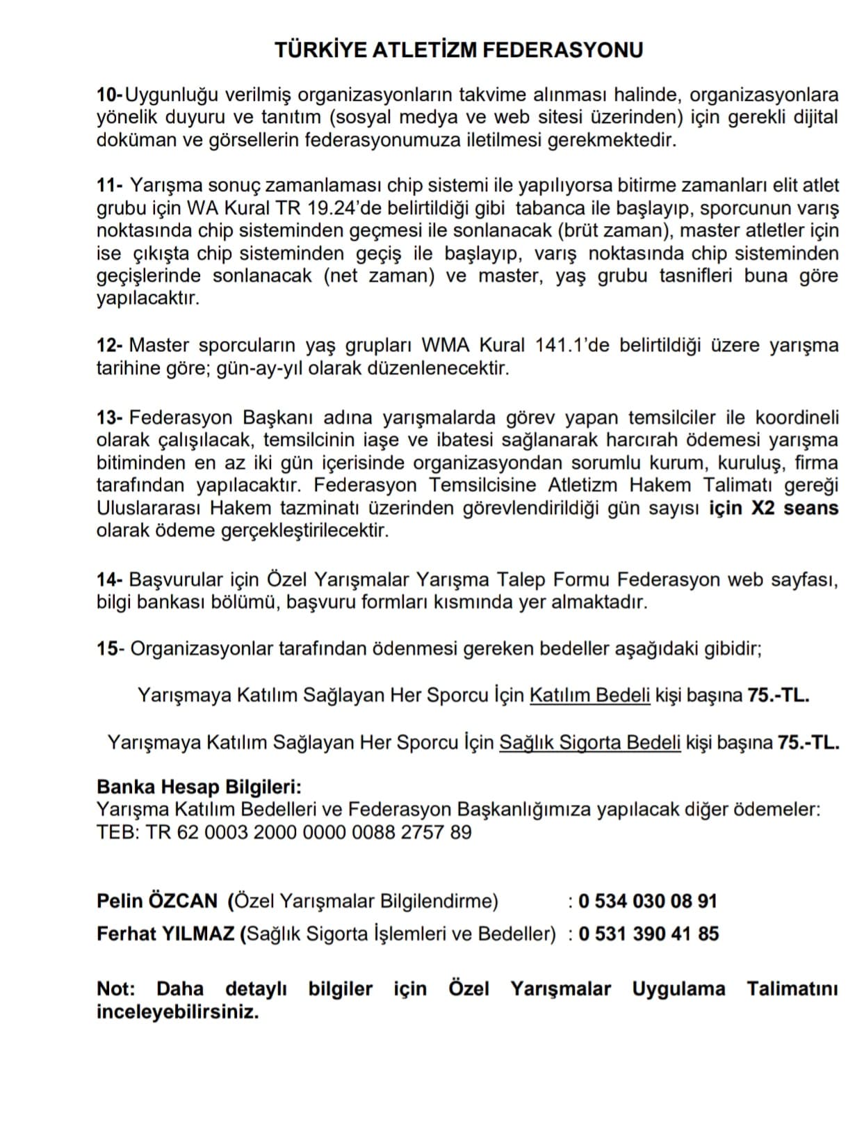 Talimat ilgili hükümleri gereği aşağıda belirtilen Özel Yarışmalar Organizasyon bedeli ve sporcu sağlık sigorta bedeli 01 Ocak 2022 tarihi itibarı ile yarışma tarihinden önce kurum, kuruluş, firma veya organizatörce federasyon hesabına yatırılacaktır. 0-500 kişi katılım 1.500-TL, 501-1000 kişi katılım 2.200-TL, 1001-2500 kişi katılım 4.200-TL, 2501 ve yukarısı 8.300-TL, Yarışma başına Sporcu sağlık sigorta bedeli 8 TL.