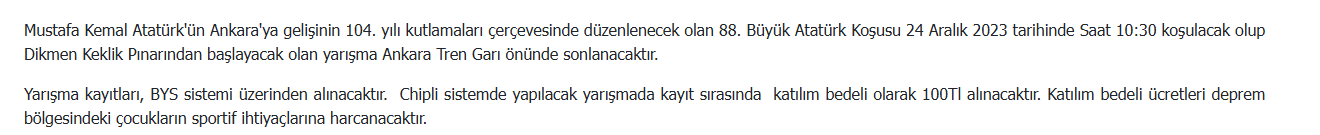 “Chipli sistemde yapılacak yarışmada kayıt sırasında katılım bedeli olarak 200TL alınacaktır. Katılım bedeli ücretleri deprem bölgesindeki çocukların sportif ihtiyaçlarına harcanacaktır.” demiş sayfada.