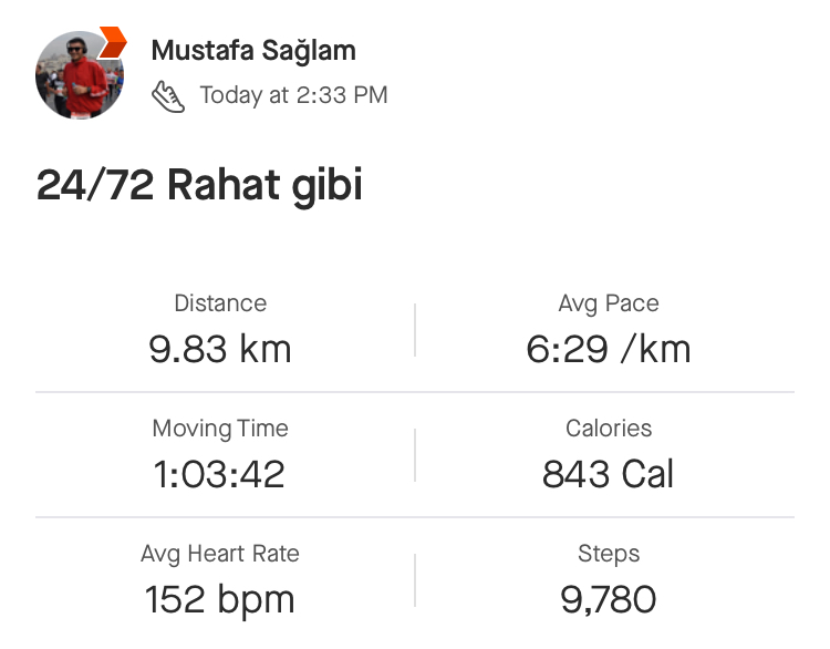 Şimdi ise bırakın 5:50 pace’i, ben 6:20-6:30 pace altına hiç düşmememe rağmen kalbim 170-180 attı. Resmen koşuya başladığım ilk günlere döndüm ![]()