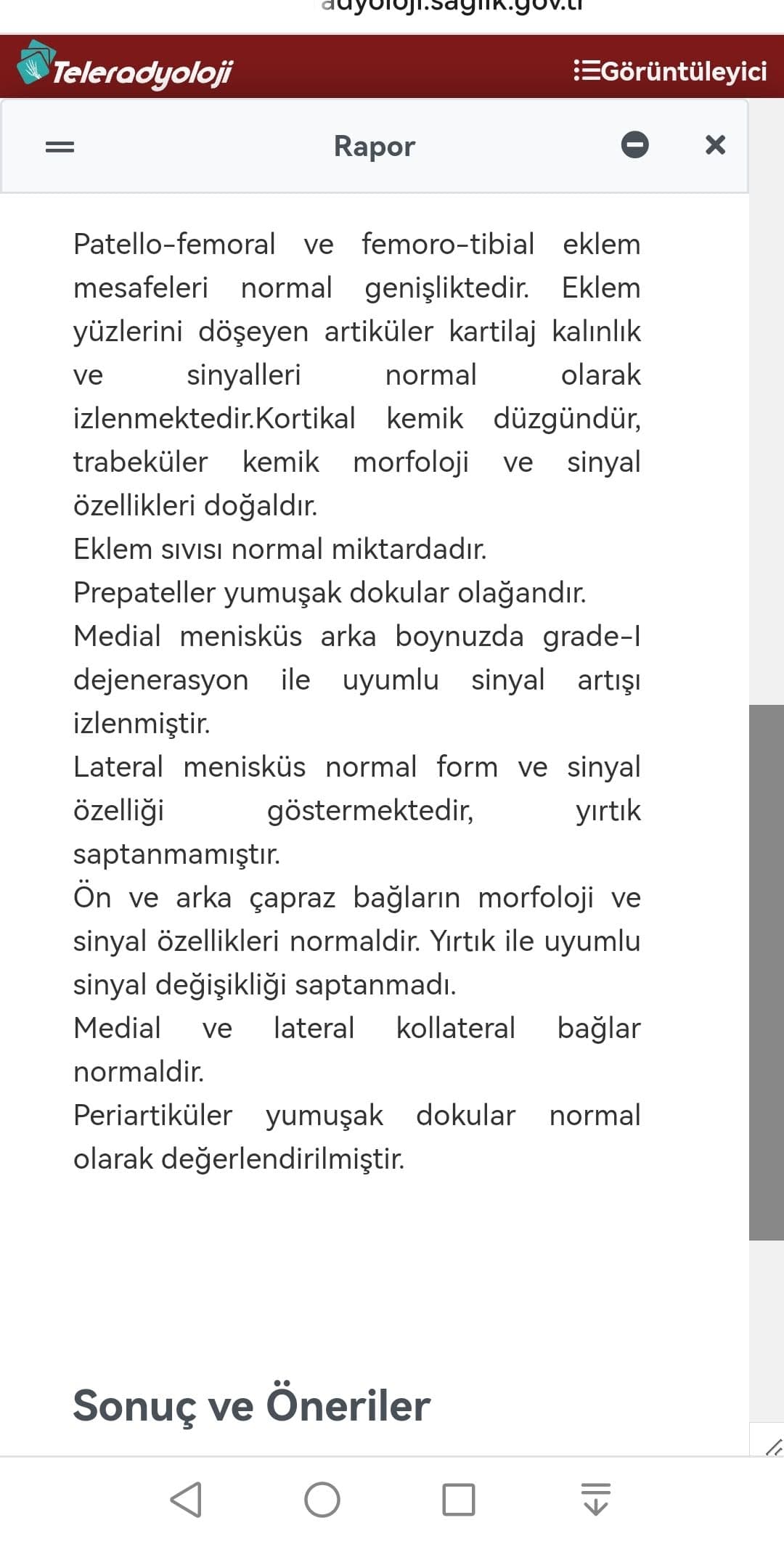 Geçmiş olsun. Bende de menüsküs dejenarasyon grade 2 ve effüzyon (sıvı toplanması) var ortopedi doktoru tilcotil ve elektra plus krem verdi kullan spor yapabilir miyim diye sorduğumda evet dedi.