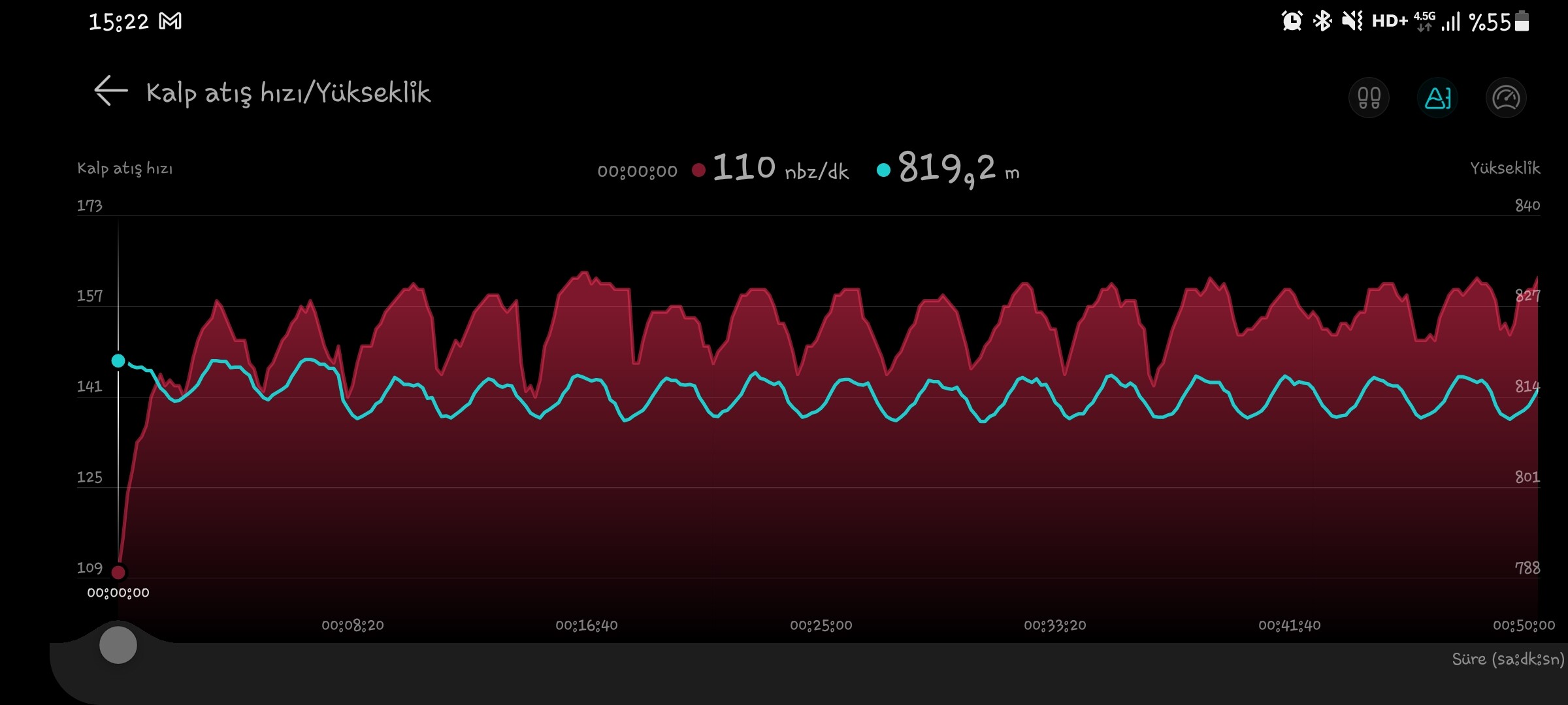 iki farkli grafik paylasiyorum. ilki dumduz bir yolda antrenman kaydi, ikincisi sehir ici hafif inis cikis durma devam ile. ama anlik peakler olusmuyor.