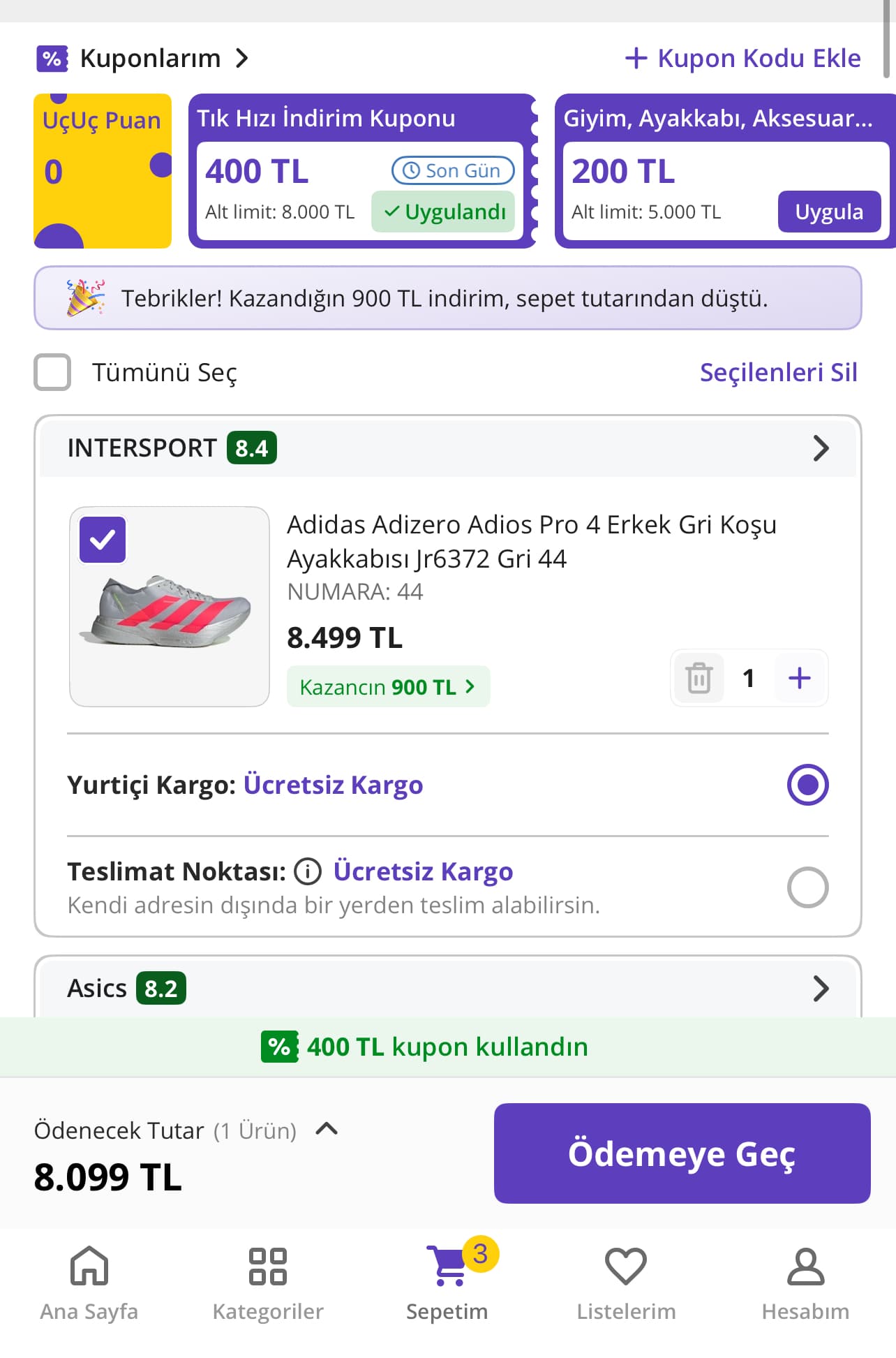 Son olarak Asics Metaspeed Sky+ 43,5 numara 8.800TL aynı sitede