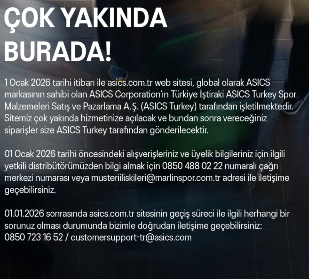 ➔ 1 Ocak 2026 tarihinden önce asics.com.tr üzerinden yaptığınız tüm işlemler Marlin Spor Malzemeleri A.Ş. tarafından titizlikle yürütülmüş ve tüm hakları saklıdır.