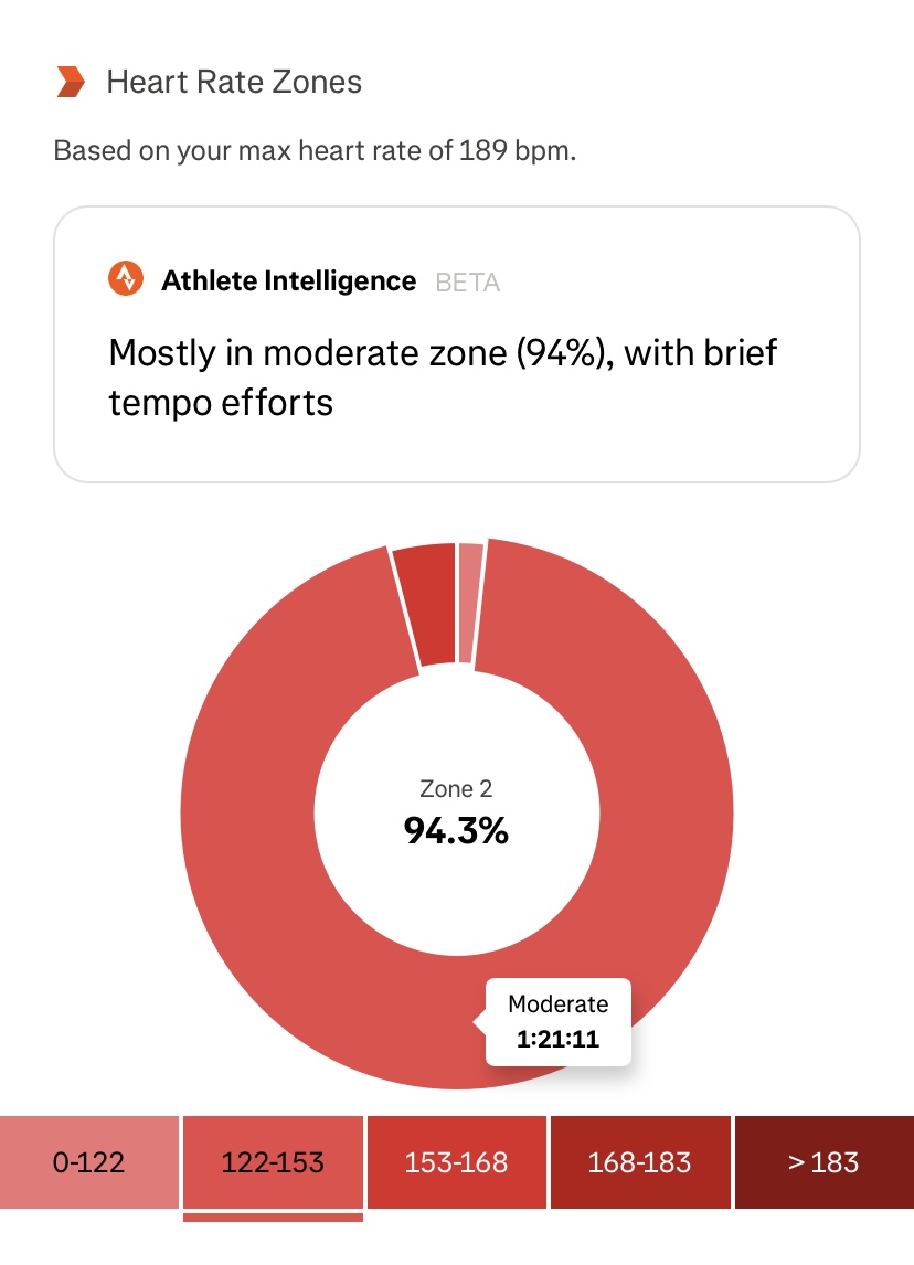 Evet bunun ben de farkındayım, kendim ayrıca bir hesap yapmadım, standart olan güvenli limandır diyerek verili olanı baz aldım ama o da biraz sıkıcı oldu. Bu vesileyle şunu da sormak isterim, aynı koşu için Strava yüzde 94 oranında Zone 2 diyor (ama “endurance” değil, “moderate” diyor, Strava için endurance Zone 1), zira o bir tarihte kaydettiği 189 max. nabza göre bir hesaplama yapmış. Bu nabza 2024’te çıkmadığımı biliyorum. Eski bir kayıt olmalı.